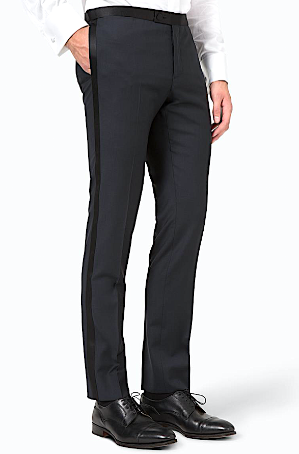 タキシードパンツとは男性の略礼服であるタキシードに用いられるパンツ。色は黒や紺が多く、脇の縫い目にシルクなどの側章を1本付けるのが特徴。燕尾服には2本の側章が付く。