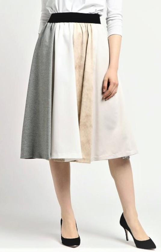 共地を短冊のように垂らしたものや、プリント柄などを用いて別布をはめ込んだように見せるものもある。フライングパネルスカートとも言う。