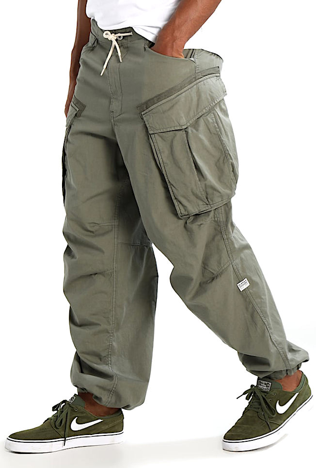 パラシュートパンツとはパラシュート部隊の制服に見られるパンツからヒントを得たもので、脚が動きやすいように全体をゆったりとさせ、風が入らないようにくるぶしでタックをとったり、裾口を絞ってカフスなどを付けたりしているのが特徴。パラシュートは「落下傘」の意。