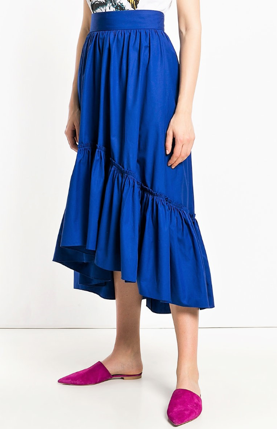 フラウンスドスカートとはたっぷりのフレアを入れ、裾をひだで飾ったスカートを言う。フラウンスは「布地を寄せる、ひだ付けをする、縮まらせる」の意。