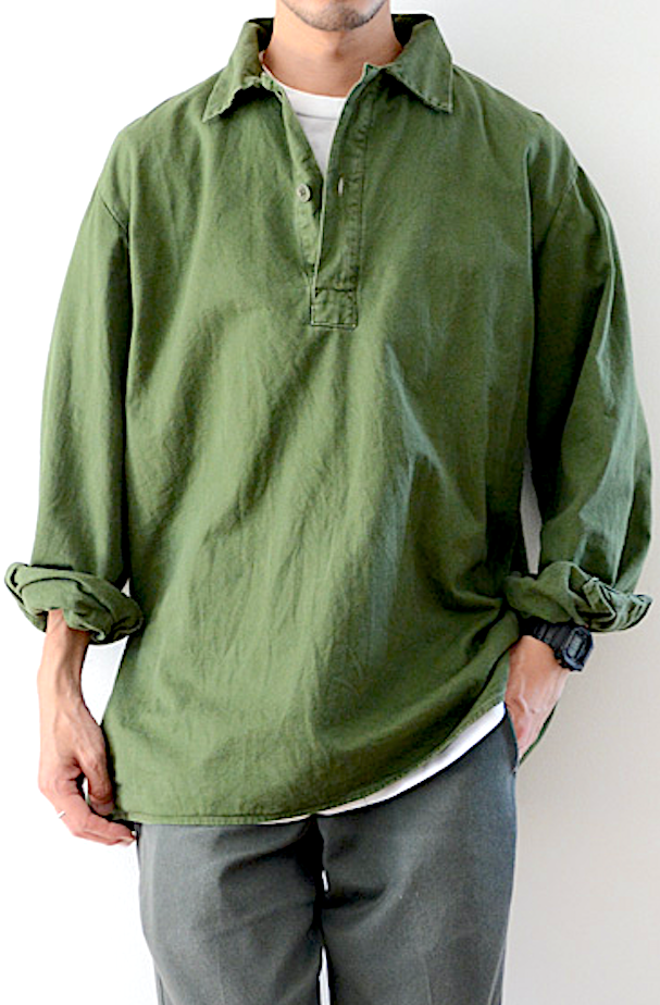 プルオーバーシャツとはかぶり型シャツの総称。一般的には前立てが上腹部まであり、その下が筒状になっている。オーバーシャツに多く、スリップオンシャツと同義。