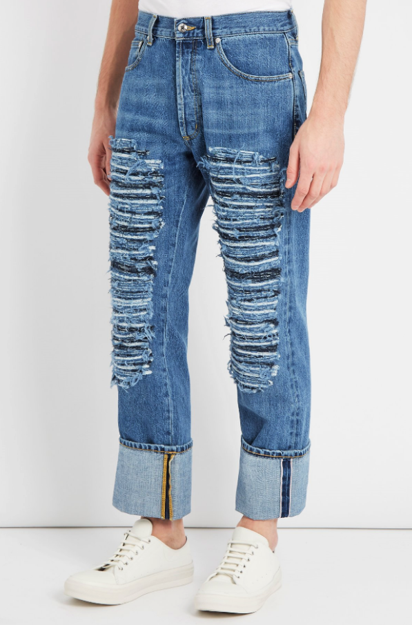 リップドジーンズとはいろいろな箇所に裂け目を入れ、ボロのように見せたジーンズを言う。リップは「裂く、切りとる」の意。穴あきジーンズとも言われ、グランジルックやボロルックの代表的なアイテムの一つ。
