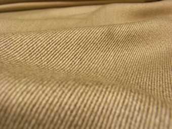 カルゼとは密度の高い2/2の綾織で、経糸には霜降りの双糸、緯糸には単糸を用いているもの。紡毛のカルゼはたて・よこに紡毛糸を用い2/2の綾織が基本である。
