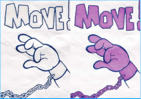太陽やブラックライトの紫外線に当ると変色するインクを使用した技法。