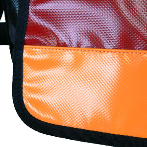 ターポリン(tarpaulin)ビニールなどの合成樹脂で厚くコーティングしたり、またはフィルムをラミネートした織物で、しかも無地染めや派手な色の、幅の広いストライプやチェックなどのもの。