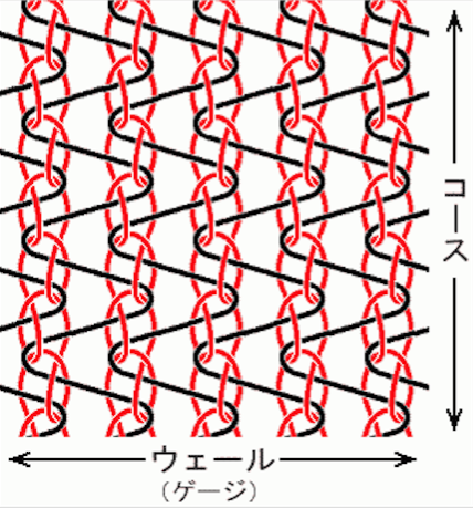 コースとはニット地で、幅(よこ)の方向に連結した編目のこと。長さの方向の連結はウェールという。