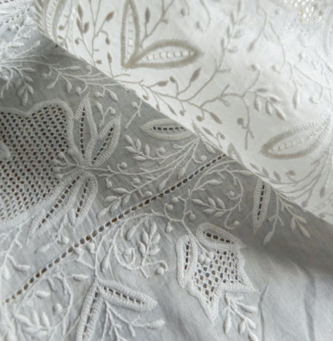 エンブロイダリーレースとは織物を基布として、機械によってまず穴をあけ、つぎにその穴の周辺を刺しゅう糸によってかがっていき、穴のあいた模様をつくったレースである。