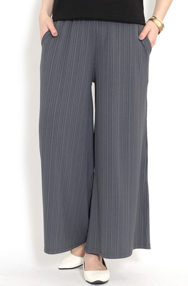 パラッツォパンツのパラッツォとは伊語で「王宮、宮殿」の意。宮殿での装いを思わせるような贅沢な布使いで、全体にたっぷりとした広がりを持つロングパンツを指す。