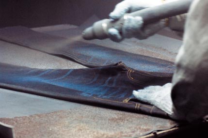 ブラスト加工とは二次的な仕上げ加工。主にジーンズ等、綿素材の布帛を用いたカジュアル商品に用いられる。砂を高速で吹き付けることにより、生地の表面を削り取り中古感を出す方法。
