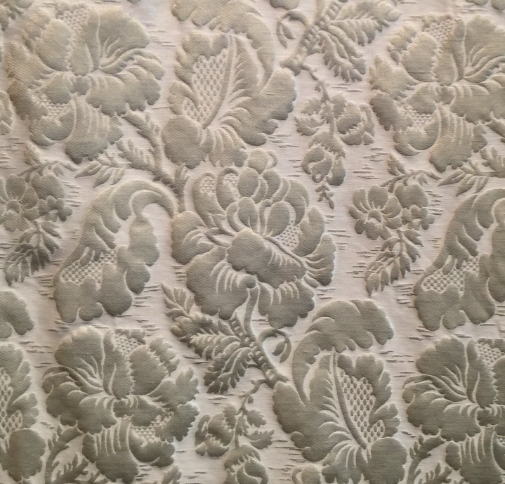 ブロカテルとは二重織のジャガードで、ブロケードに似た織物。細い絹糸を使い、綴密に織った地合いのしっかりした平織または綾織物で、模様の経朱子部分がふくらんだ感じになっているのが特徴。