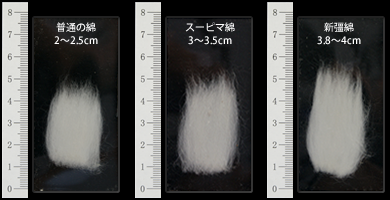 原綿繊維の長いスーピマ綿は毛羽が少なくすむので糸が普通綿と比べて痩せにくい。超長綿は耐久性と柔軟性がある。