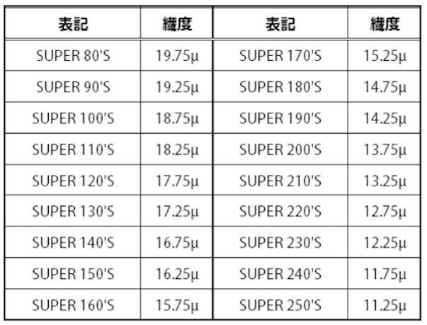 繊維が細くなる程に生地の打ち込み本数が増し、仕上り時のしなやかさ、ドレープ性、光沢が増すが、生地強度は落ちる。日常的に着用するスーツの場合はスーパー120'sウール程度が強度限界であり、それ以上の細番手の物では日常の運動摩擦、引っ張りに繊維が耐えられず傷みが早い上、極端にシワが入りやすくなる。生地に光沢が有り価格も高価となる為、フォーマル用途のスーツに適している。