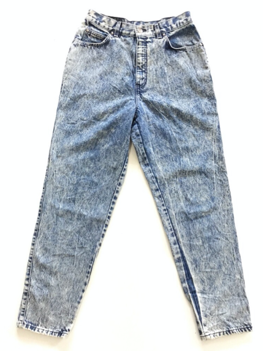 ケミカルウォッシュジーンズとはジーンズの仕上げ加工の一つで、塩素系の薬品によって化学反応で部分的にムラに脱色し、中古風に仕上げたジーンズのこと。加工されたジーンズは他にストーンウォッシュジーンズ等がある。特有のムラ感が分かりやすく、1980年代に世界中で大ブレイクし、ハイファッションブランドから低価格の日用衣料まで幅広く採用された。