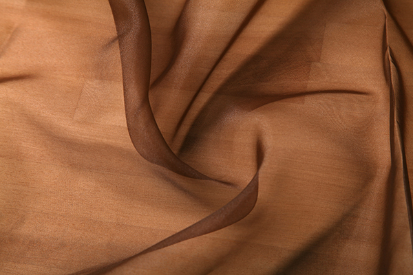 オーガンジーとは薄地で軽く透けて見える硬い手触りに仕上げた平織物のこと。硫酸処理によるスイス仕上げによって張りのある風合いと光沢感をもっている。