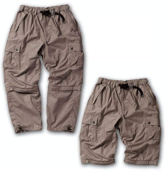 コンポパンツとはファスナーや留め具を用いて、パンツ丈を長くしたり短くできるパンツを指す。コンポはコンポーネントの略で、「組み立て式」の意。