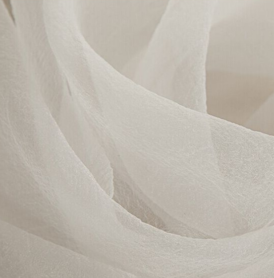 細くて、密度が込んで、薄く透いて見える、ということになると、糸使いはフィラメントになり、組織も平織になる。生糸が多く使われていたが現在ではポリエステルフィラメントが主流で300、500、75Dぐらいの太さの糸に中くらいの強さの撚り(500の場合1,500T/mくらい)をかけたものを経糸、緯糸に使って平織にしたものである。