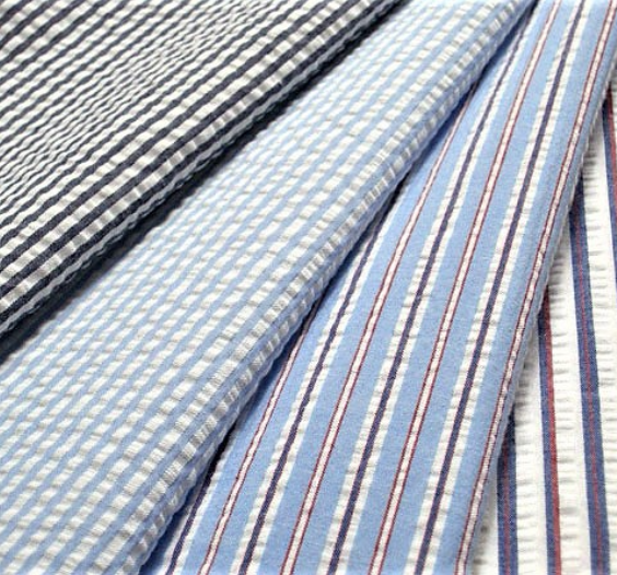 シアサッカーとは縦の方向に、波状の凹凸のある部分と平らな部分とが、縞を現わした織物です。これは製織の際、波状の部分の経糸を、平たい部分の経糸よりも張力をゆるくして(つまり、余分に経糸を送り出すようにして)織り上げます。