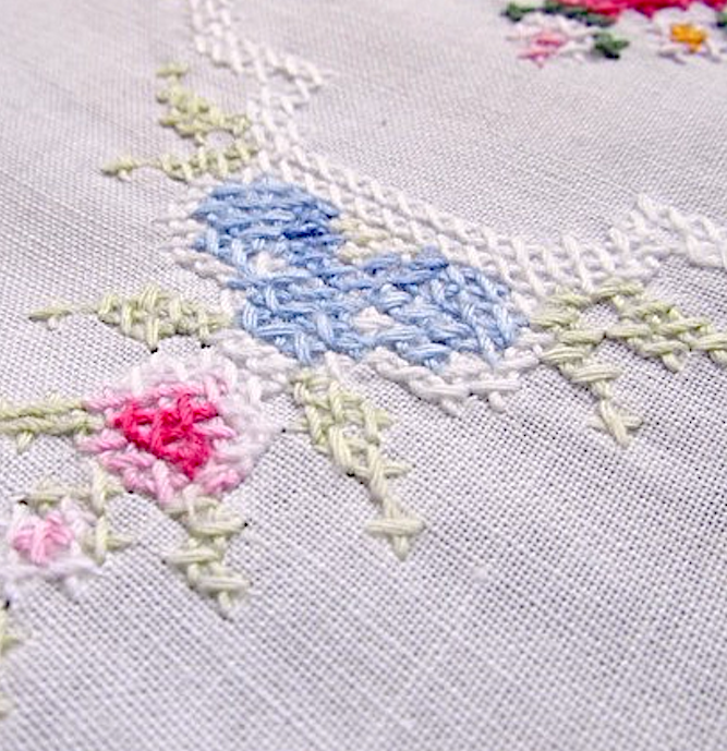 ビソリネンとは糊を付けた細い亜麻糸で織った、透き通るような織物で、手ざわりの硬いもの。祭壇用やドロンワーク用の基布に使われる