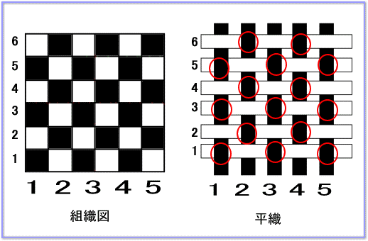 織物とは経糸緯糸を直角に一定の方向に織り込んだ布地。平織綾織(斜文織)、朱子織の三種が代表的で基本三原組織と呼ばれる。